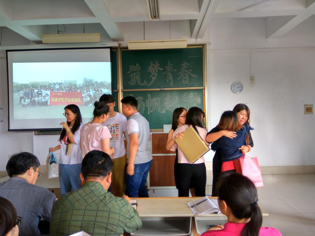 首先,由团总支书记刘毅老师宣读了2017届学生会成员名单。随后,老师们以及学生会全体成员观看了2016届学生会纪念视频。视频过后由各部代表给即将离开的2016届学生会成员送上精心准备的礼物。他们眼含泪水,依依不舍地拥抱,仿佛还有说不完的话,道不完的情,此时,2017届学生会成员异口同声喊出的“学哥学姐,我们爱你!”更是让他们多了一份不舍。