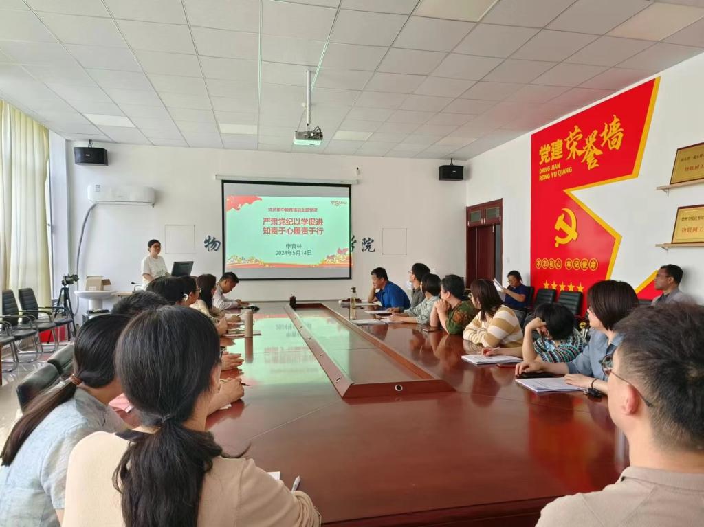 学习活动的第三阶段,与会党员观看了警示教育典型案例。与会党员开展了以案说德、以案说纪、以案说法、以案说责研讨,通过深刻剖析违纪典型案例,让党员干部受警醒、明底线、知敬畏,发挥警示、震慑、教育作用。学习活动的第四阶段,学习党员集中教育培训主题党课。申青林同志以“严肃党纪以学促进,知责于心履责于行”为题为全体教师党员讲党课。