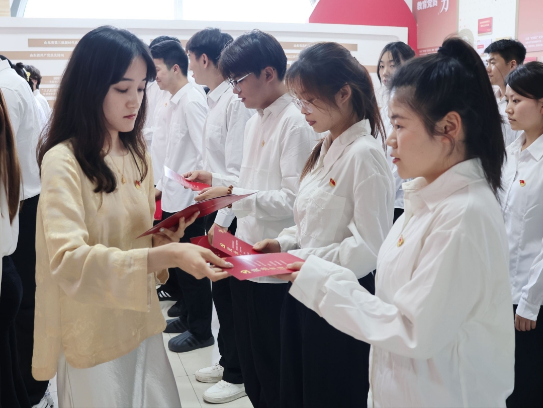 活动现场,全体党员高举右拳,在鲜红党旗前,跟随领誓人齐声宣读入党誓词。铿锵有力的誓言回荡,不仅是对入党初心的深情回望,更是对新时代使命的郑重承诺。第三学生党支部宣传委员宋言昕为党员们送上精心准备的政治生日卡,卡片上入党誓词与党组织的祝福期望,承载着组织关怀,时刻提醒党员牢记身份、践行使命。