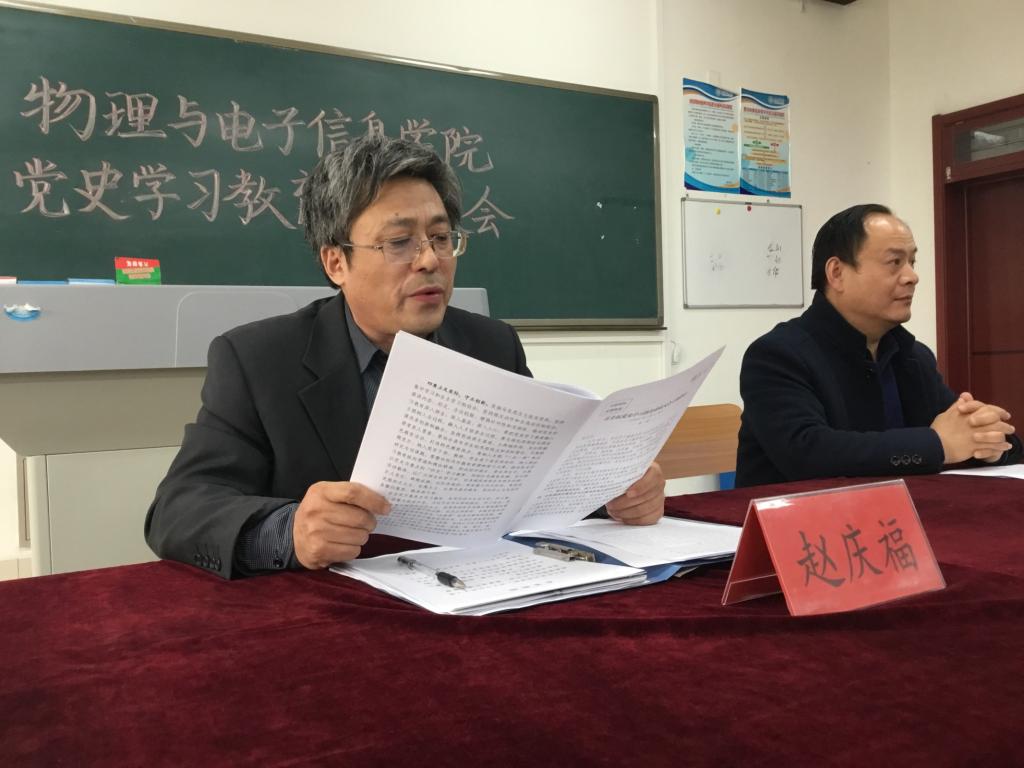 会上,刘汉平院长简单介绍了会议议程,赵庆福书记发表讲话。赵书记首先宣读了习近平总书记讲话重要内容:深刻领会“三个必然要求”的重大意义,切实增强“四个意识”、坚定“四个自信”、做到“两个维护”。要求物电学子要在党史学习教育的过程中做到学史明理、学史增信、学史崇德、学史力行,学党史、悟思想、办实事、开新局。赵书记指出滚球买球的app官网要把党史学习教育这项重大政治任务置于突出位置,压紧压实责任,树立正确党史观,创新方式方法,切实增强开展党史学习教育的思想自觉、政治自觉和行动自觉,充分发挥主体作用,高度重视、提高站位,调动广大物电学子的积极主动性。最后,刘院长进行总结发言:希望以党史学习教育为契机,引导广大滚球买球的app官网老师、学子坚定信仰之心、忠诚之心、赤子之心,立志做党的光荣传统和优良作风的忠实传人,高质量完成学习任务。