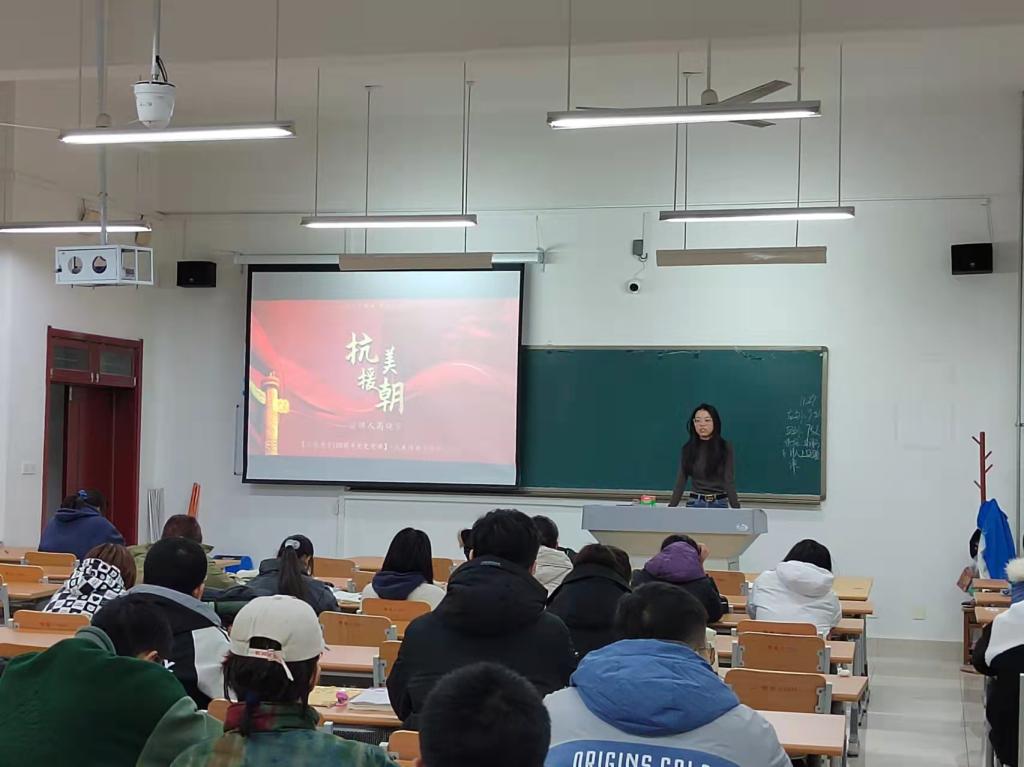 在此次活动中宣讲员高晓宇主要从抗美援朝的历史背景,进行抗美援朝战争的原因,抗美援朝战争的过程及抗美援朝战争的伟大意义等部分入手,带领同学们学习了解了抗美援朝战争的有关知识,引发了同学们积极思考与讨论,引导学生传承和发扬伟大的抗美援朝精神。
