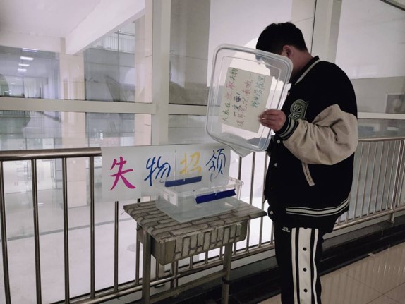 活动负责人于修读点设置了失物招领箱,并通过在各班班级群开展宣传工作,得到了同学们热烈的响应。失物招领箱为同学们的日常生活起到了巨大的帮助作用。学生会青志部也会派成员每天去核对箱子里的失物个数,防止失物被冒名领取。
