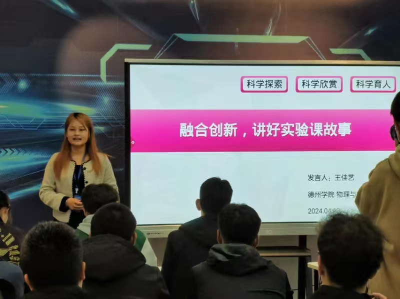 4月13日,滚球买球的app官网的2021级物理学(师范)专业王佳艺同学应邀在全国大学生物理实验竞赛(创新)山东地区研讨会上,做了题为“融合创新,讲好实验课故事”的报告,分享了她获得第九届全国大学生物理实验竞赛(创新)讲课类一等奖的经验。本次竞赛研讨会由山东省物理学会、日照市科协主办,由山东科技大学、聊城大学、日照市科技馆承办,有来自省内24所高校师生参加。