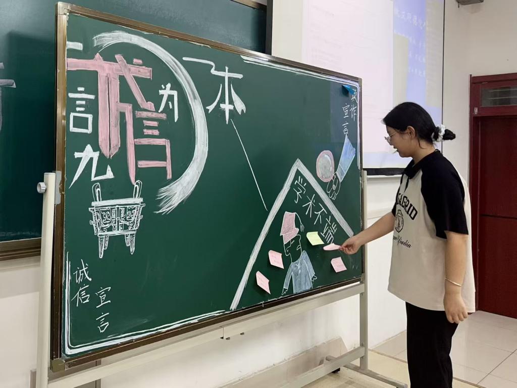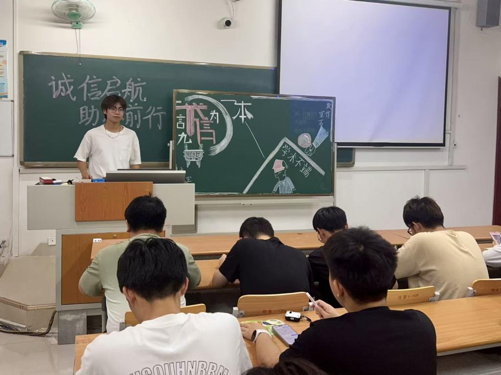 活动现场,在主持人的引导下,全体参与同学依次登台,将象征学术不端的"虚假承诺""欺诈宣言"等负面标签当众撕毁,并将写着"抱诚守真""诚信誓言"的承诺标识张贴至诚信墙上。专题教育环节中,《诚信的价值与法律边界》纪录片深度剖析了诚信在学术创新、职业发展及社会治理中的核心作用。通过典型案例解读与法律条文阐释,系统梳理了科研诚信作为学术生命的重要意义,引导学生理解学术规范的伦理内涵与法律边界,树立正确的学术价值观。