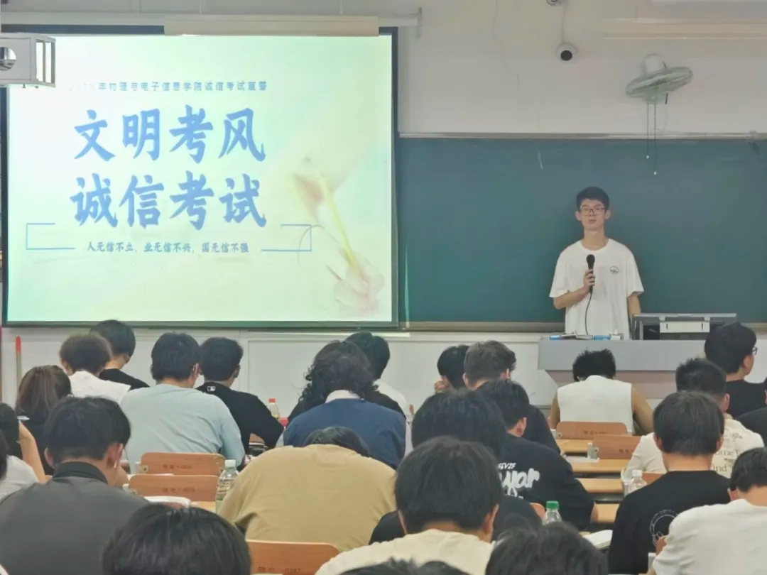 宣讲会上,邱明志以“文明考风,诚信考试”为主题展开此次活动。邱明志认为,诚信不仅是个人立身之本,更是学术研究的生命线。考试作为检验教学成果、衡量学生知识水平的重要环节,容不得半点虚假。同时传达学院思想始终将诚信教育融入人才培养全过程,希望全体学子恪守学术道德,以扎实的知识储备和端正的考试态度迎接检验,以实际行动维护公平公正的考试环境,为学院优良学风建设贡献力量。在庄严的宣誓环节,全体同学们在邱明志的带领下,高举右拳郑重承诺:“严守考场纪律,弘扬诚信美德;拒绝一切作弊行为,以真才实学彰显物电学子风采!”铮铮誓言在教室回荡,将活动气氛推向高潮。随后,在邱明志的引领下,全体同学以严谨有序的姿态,依次在主题横幅上郑重签署姓名,以庄严的笔墨践行对诚信品德的承诺,让签名仪式成为传递诚信理念、强化道德共识的生动实践,在规范庄重的仪式感中凝聚起崇信尚德的集体力量。此外,现场还设置了答疑环节,针对同学们提出的考试安排等问题,学科部同学一一进行耐心解答,现场气氛热烈而有序。