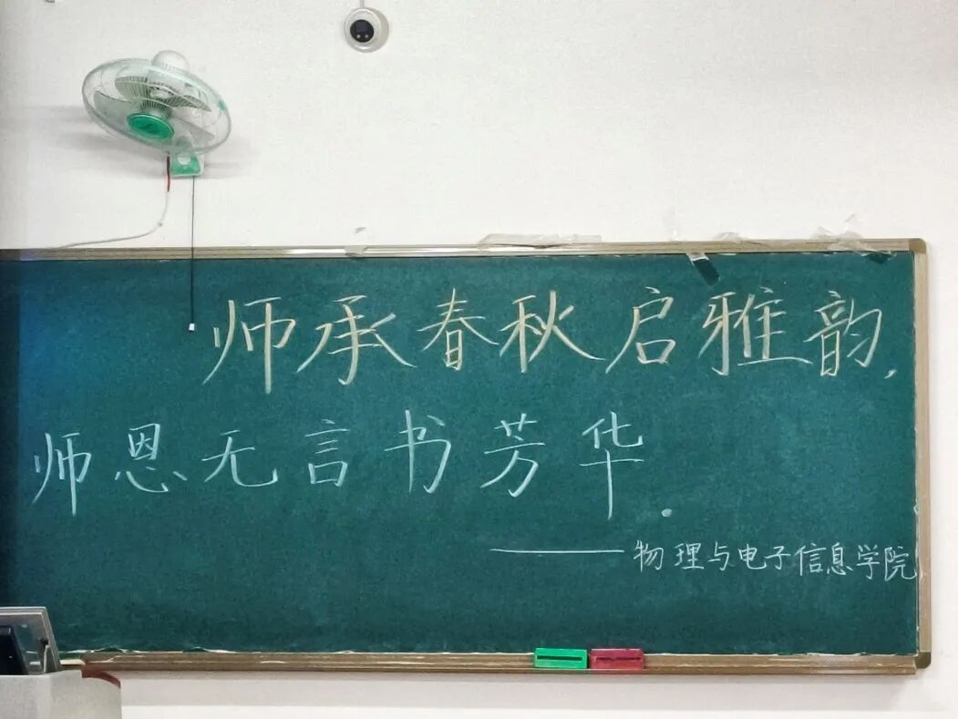 为确保活动有序开展,各班级提前启动筹备工作,通过集体讨论明确分工,细化流程。各班级学生代表提前抵达对应授课教室,以彩色粉笔为创作载体,在黑板上进行精心布置:既书写“师承春秋启雅韵,师恩无言书芳花”“师恩难忘,祝您节日快乐”等饱含敬意的祝福语,又辅以花朵、书卷等象征教育与感恩的图案点缀,将普通黑板转化为传递学子心意的“感恩展示板”。上课预备铃响前,教师步入教室瞬间,全班学生同步起身,以标准鞠躬礼配合整齐划一的节日问候,将预设惊喜完整呈现。教师们在意外之余纷纷展露欣慰笑容,现场氛围庄重而温馨。活动尾声,师生共同在装饰完成的黑板前合影,以影像记录下这一彰显师生情谊的珍贵时刻。