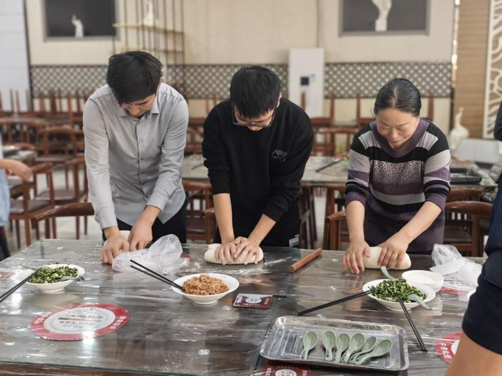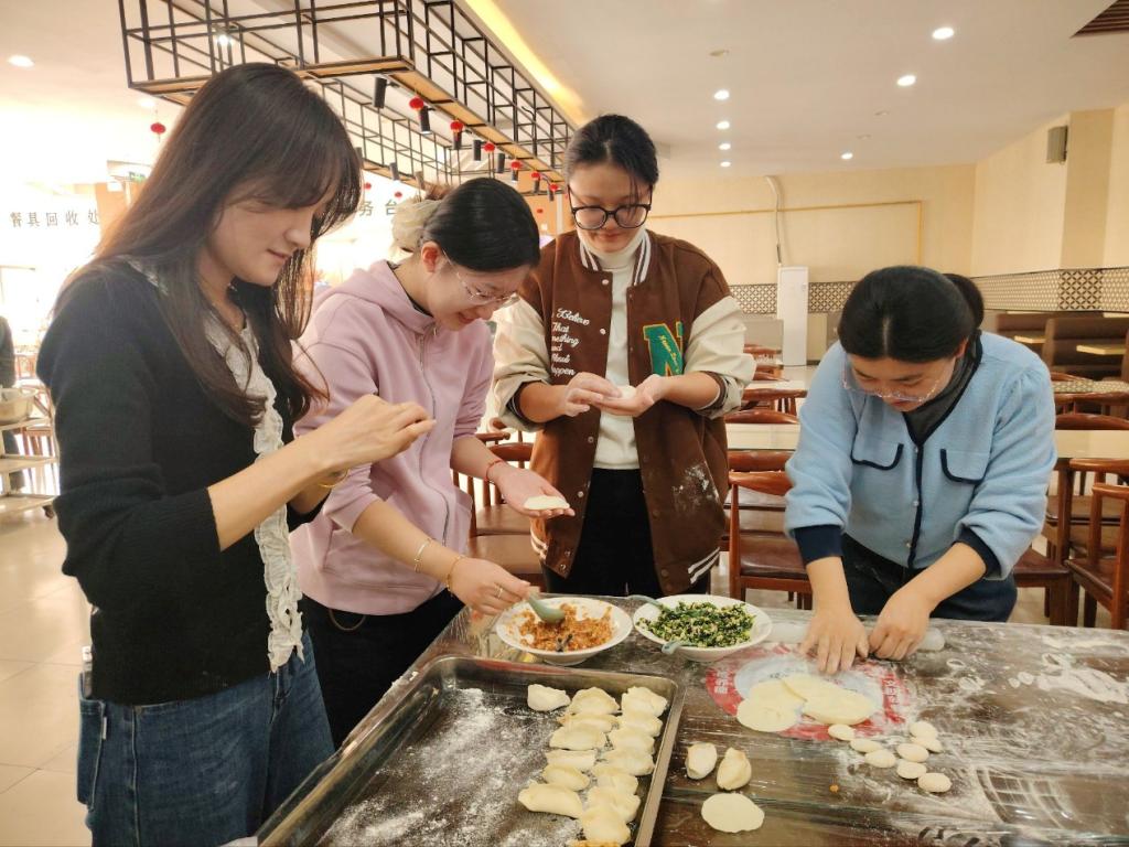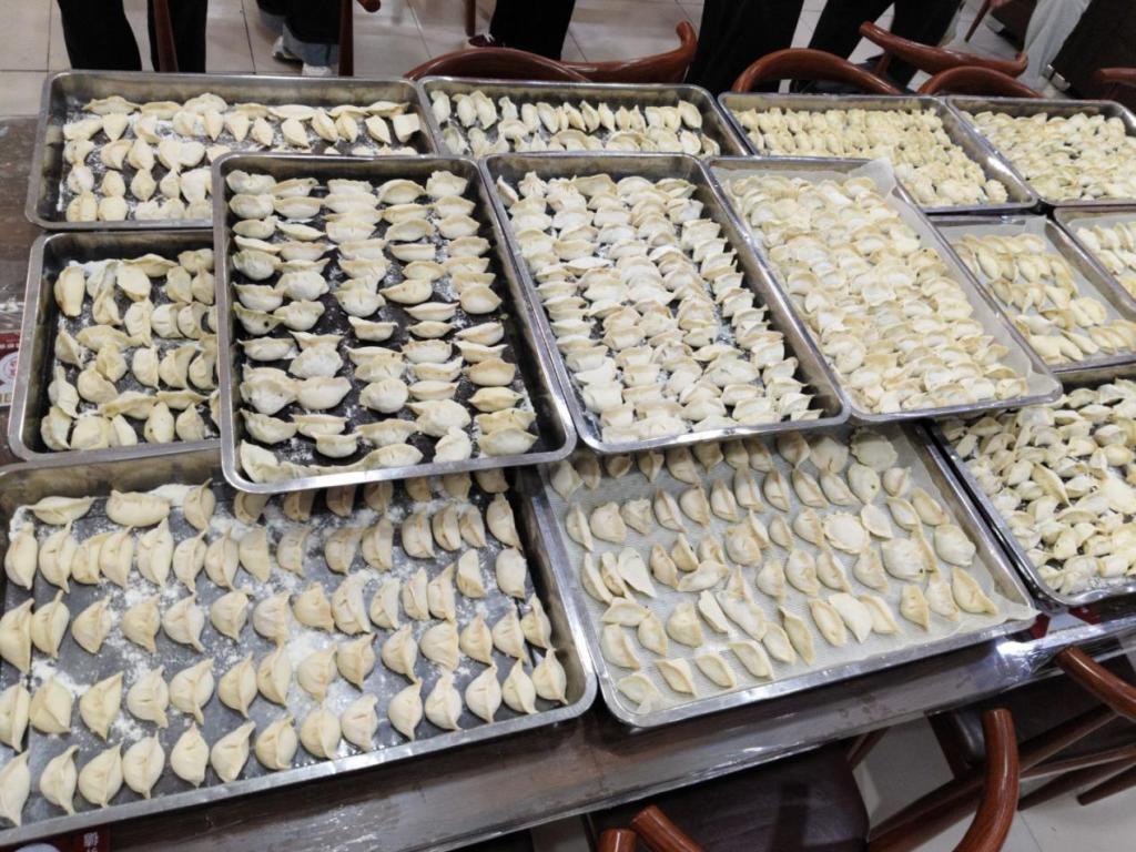 食堂内暖意融融、热闹非凡。老师和志愿者们提前就位,精心备妥了新鲜食材与包饺子所需的各类工具,为活动顺利开展筑牢基础。老师和同学们分工协作、默契十足,有的专注擀皮,有的细心包馅,手法娴熟利落。历经一个多小时忙碌,一个个形态各异的饺子在指尖灵动成型,整齐码放在餐盘之中,既饱含创意巧思,更满含真挚心意。