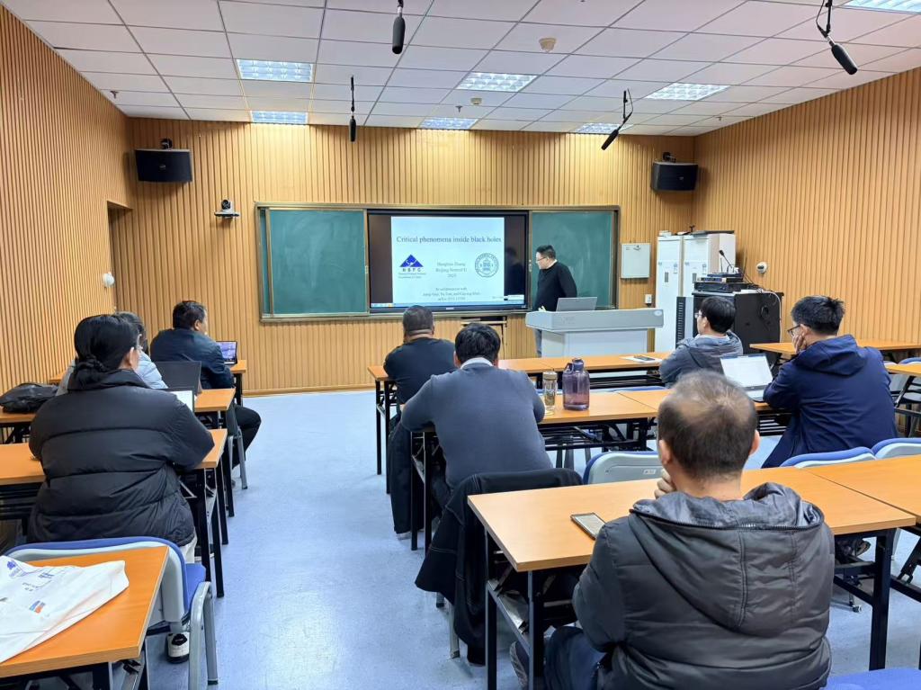 张教授以《黑洞内部的临界现象》为题作了精彩学术报告。黑洞作为爱因斯坦广义相对论最美丽的预言之一,不仅在人们理解各种天体物理学现象方面发挥着至关重要的作用,而且为研究者了解时空和量子引力的基本性质提供了宝贵的线索。张宏宝报告了其在r=0奇点形成阈值处黑洞内部临界现象的最新数值研究。此研究类似于1993年由Choptuik发现的黑洞视界形成阈值处的著名临界现象。在讨论环节,张宏宝与在场老师讨论了奇点的相关问题,深入解释了临界现象的物理意义,并就如何高效撰写科研项目申请进行了深入交流。