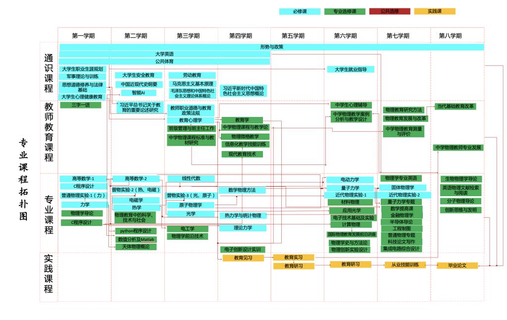 力学、热学、电磁学、光学、原子物理、理论力学、电动力学、热力学与统计物理、量子力学、固体物理学、教育学、教育心理学、中学物理课程与教学论。
