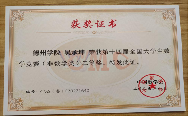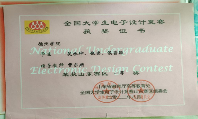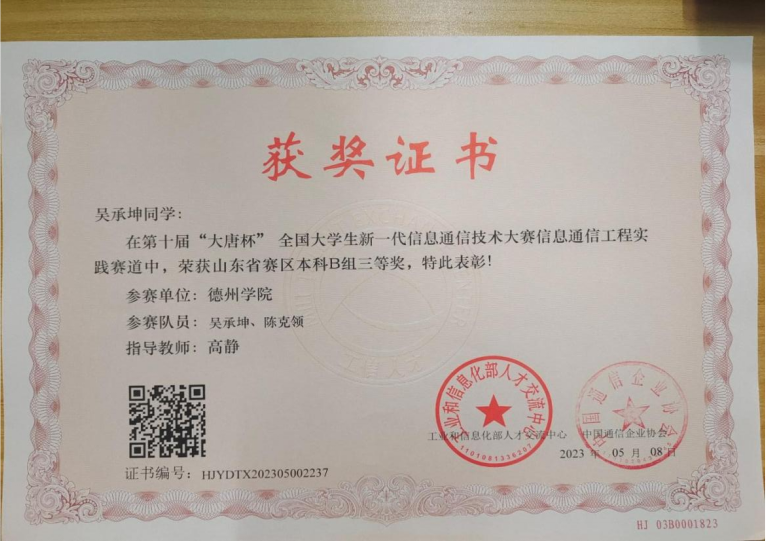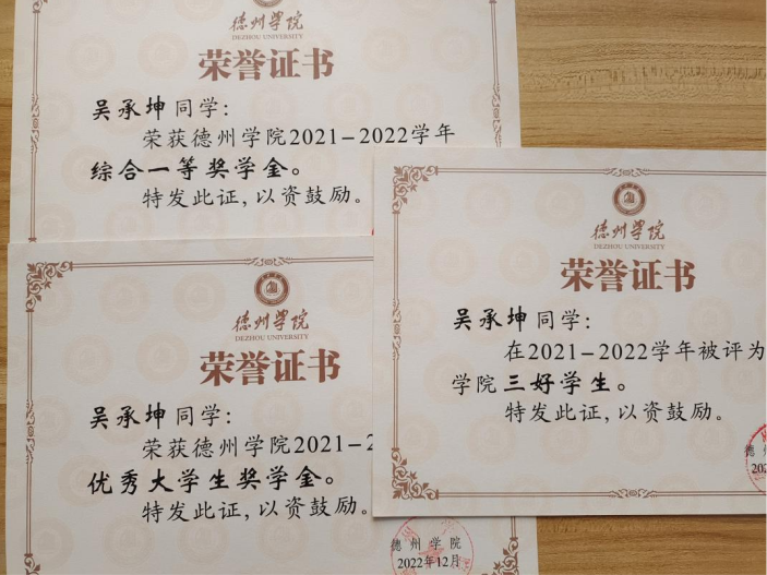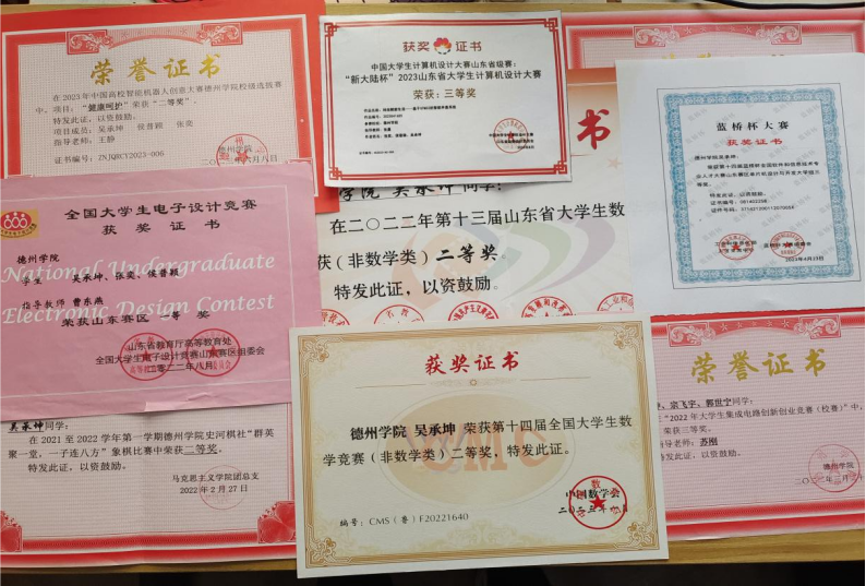 吴承坤,共青团员,滚球买球的app官网物联网工程(移动互联)专业学生。2021-2022、2022-2023学年连续两学年学业成绩和综合成绩均位于专业第一名,2021-2022学年荣获德州学院综合一等奖学金、优秀大学生奖学金、三好学生,2022-2023年荣获德州学院综合一等奖学金、优秀大学生奖学金。获全国大学生数学竞赛二等奖,全国大学生电子设计竞赛山东赛区一等奖,大唐杯全国大学生新一代信息通信技术大赛省赛三等奖,蓝桥杯全国软件和信息技术专业人才大赛省赛三等奖等省级奖项6项,全国大学生电子设计竞赛德州学院校赛一等奖等校级奖项5项。
