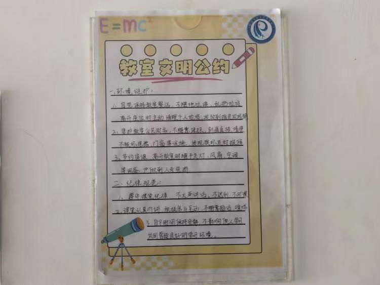 教室文明公约以学习环境为核心,围绕课堂纪律与环境维护制定规则,“课后随手清垃圾”“尊重师长守时守纪”等条款,体现同学们对安静有序、文明互动课堂的共同追求,致力打造沉浸式学习空间。