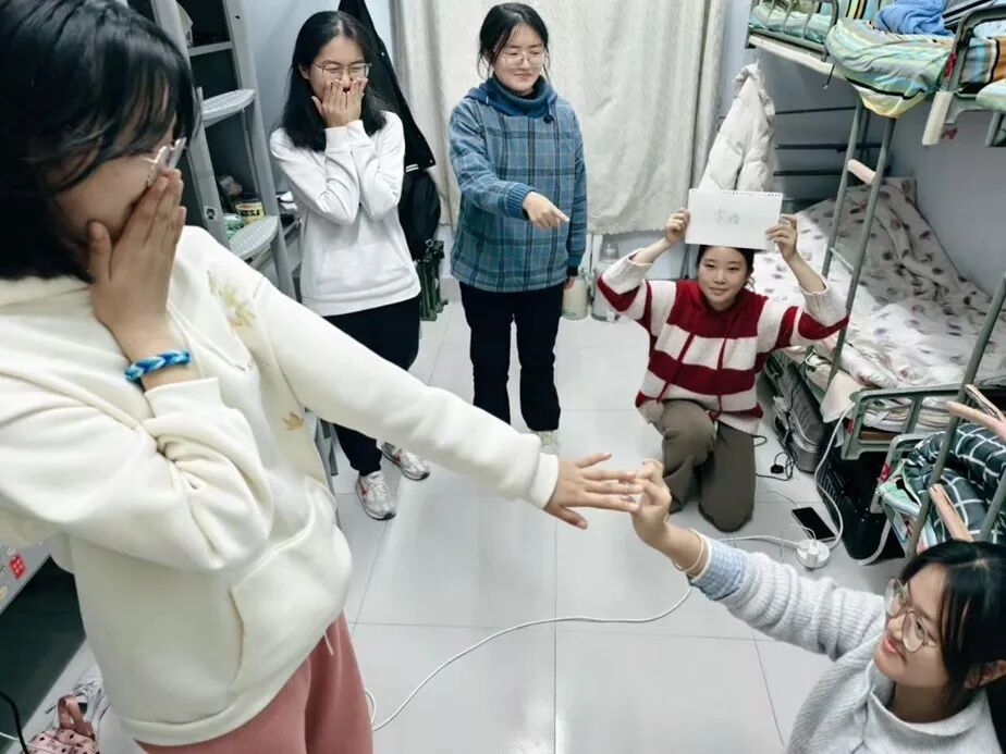 活动现场,一系列精心设计的互动游戏依次开展,迅速点燃了全场氛围。在“你比划我猜”环节中,参与者们通过夸张生动的肢体语言传递信息,与队友天马行空的猜想相互碰撞,现场不时响起阵阵欢笑;蒙眼互打环节里,同学们在“黑暗环境”中展开趣味较量,在小心翼翼的试探与出其不意的出击之间,将平日积累的学习压力尽情释放。此外,“拍大腿”“害你在心口难开”等经典游戏也各具特色,既考验参与者的反应能力,又融入了策略比拼的乐趣。活动中,主持人们全程热情引导、高效控场,持续带动现场气氛,让同学们在轻松的互动交流中彻底放松心情,充分感受活动带来的欢乐。