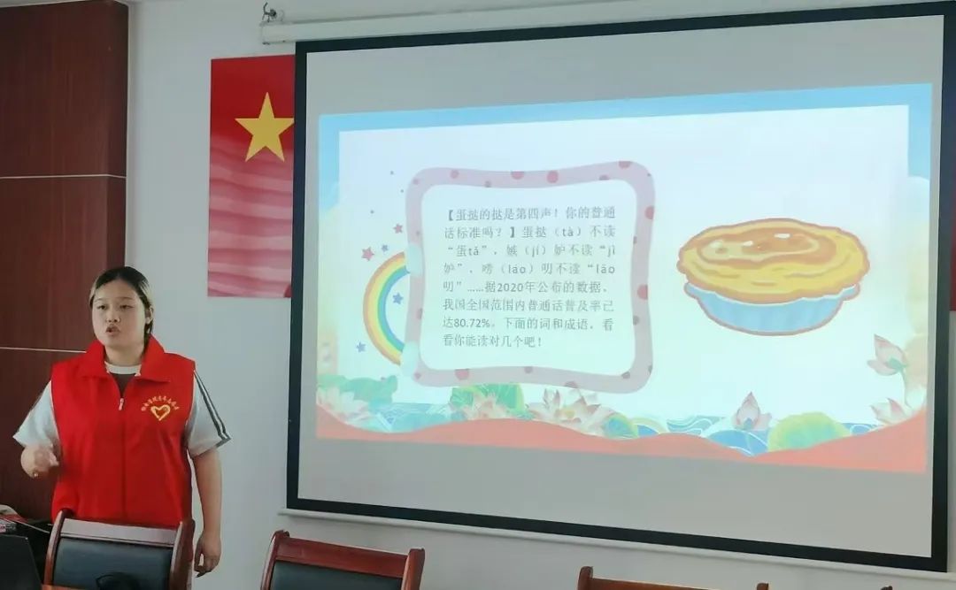 活动中,志愿者向大家科普了普通话的起源,讲解推广普通话的重要意义,并通过数据向大家介绍了现在普通话使用情况。在交流互动环节,志愿者们亲自示范正确的发音方式,让居民们共同感受普通话的魅力,意识到国家通用语言文字的重要性。此外,志愿者还设计了有趣的游戏环节,调动起居民们学习普通话的热情,让居民们更加全面、深入地了解普通话的意义。