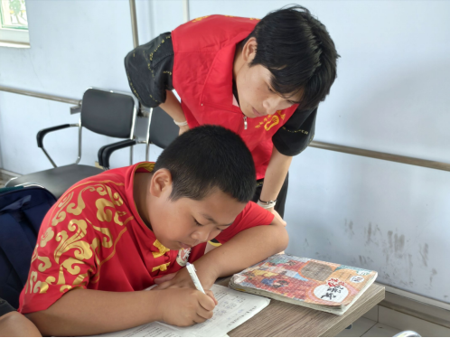 活动现场,志愿者们在社区为小朋友们提供全方位学习辅导。他们陪伴孩子们自主完成课业,逐份细致检查作业质量,针对数学应用题、语文作文等易错题型开展"一对一"精准辅导。创新实施"学科分段辅导+专项能力提升"模式,结合各年级知识难点,穿插数学速算技巧特训、语文阅读方法精讲等专题课程。通过设置"知识闯关""趣味问答"等互动环节,将枯燥的知识点转化为生动的学习游戏,让小朋友们在寓教于乐中夯实知识基础。