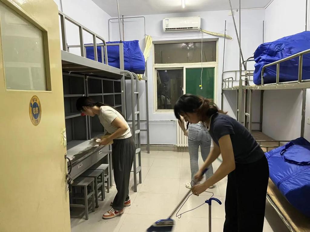 清理过程中,同学们展现出积极向上的精神状态,发挥出物电学子“吃苦耐劳”的良好品质。学生们打扫细致入微,从床铺到墙面,不放过任何一个角落,对房间里的每一处都进行仔细清扫,对门窗、地面进行擦拭与垃圾清除。