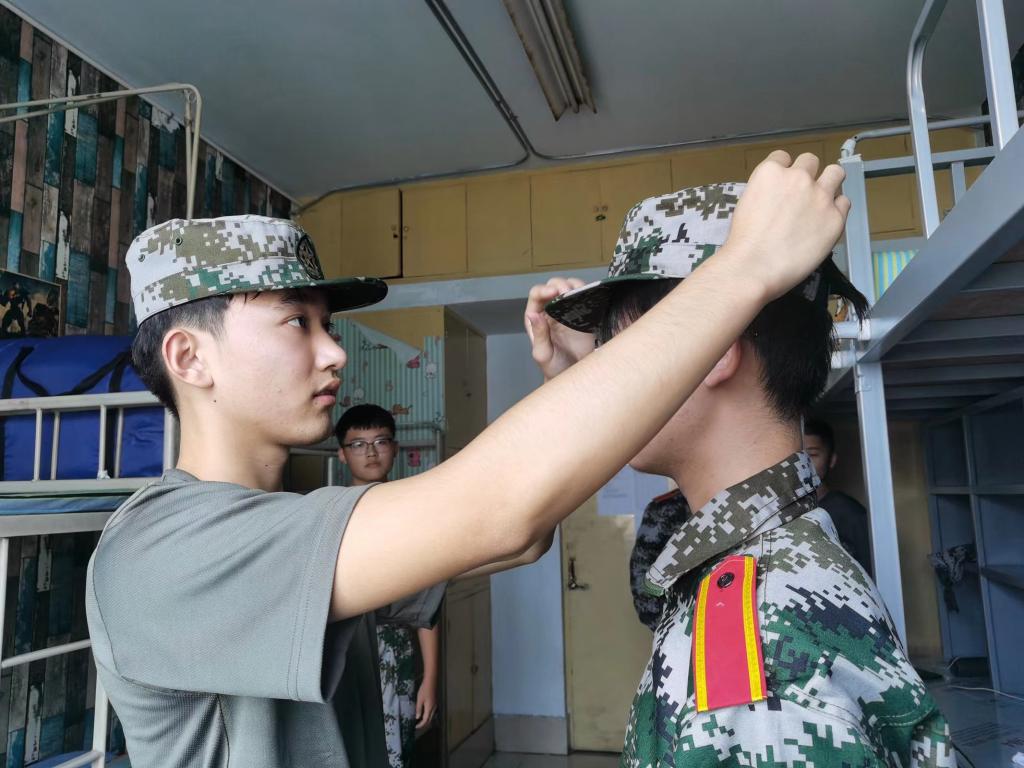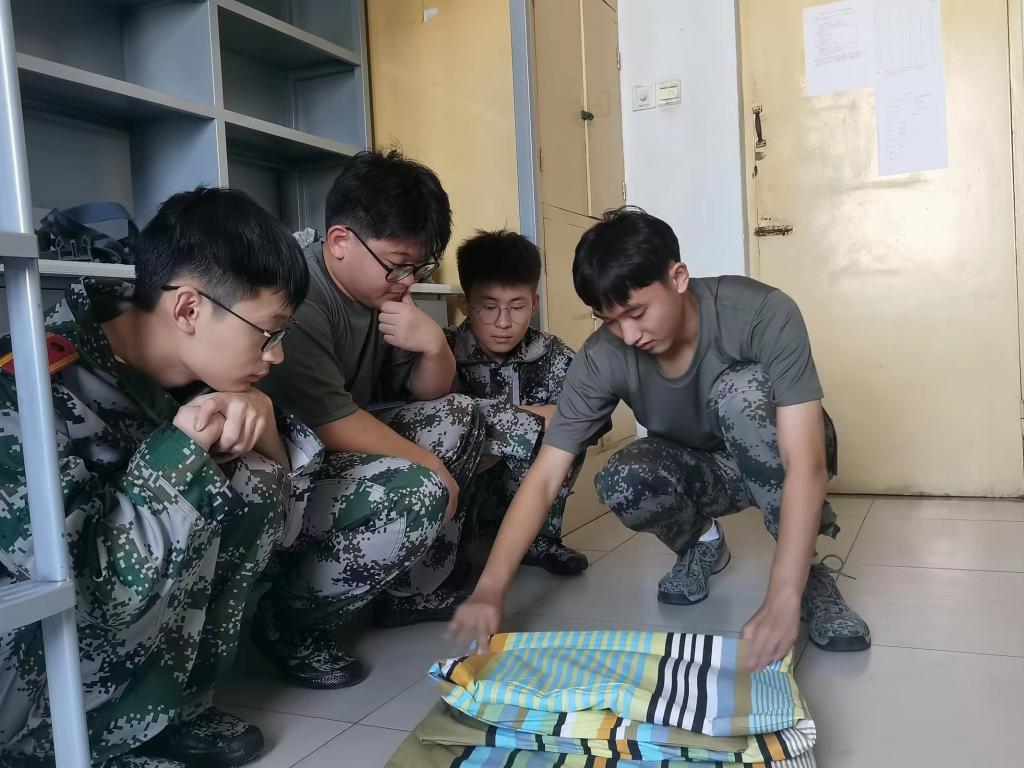 教官走进寝室,亲自示范如何叠被子、挂毛巾、摆放物品等操作,向新生讲述内务整理的技巧。对于军训标志性“豆腐块”被子的操作要领,同学们认真观察教官的示范动作,并反复练习。运用“压、折、挤、掏”等基本动作完成从棉被到“豆腐块”的进步。此外,教官对卫生区洗漱用品的摆放提出整改要求,新生积极配合重新布置摆放。经过整改后,学员内务整理工作取得显著效果。方方正正的被子,摆放得井井有条的日常用具,这些都成为寝室里一道靓丽的风景线。