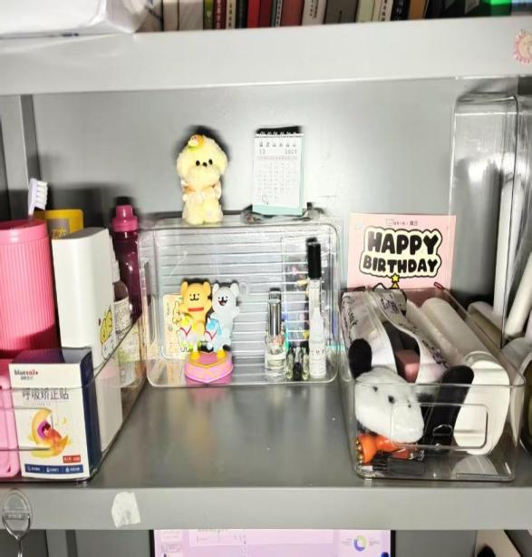 三是简易易维护:拒绝复杂分区,用普通收纳盒归集零散物件并贴签标识,日常用完随手归位,人人都能轻松维持寝室整洁舒适。