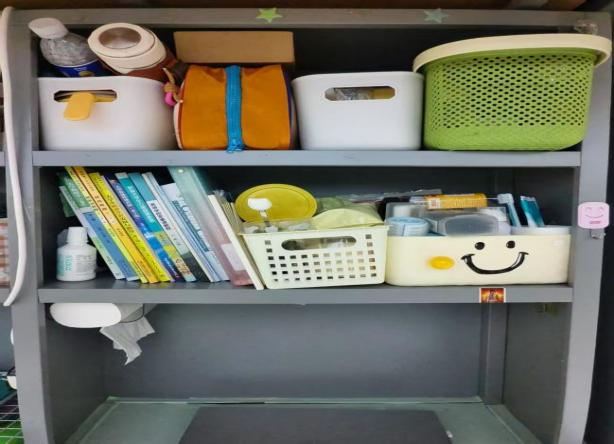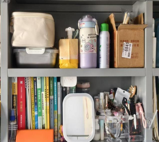 一是按使用频率归类:常用课本、护肤品放桌面和床头置物架,换季衣物与闲置杂物收进高处储物柜,无需翻找。