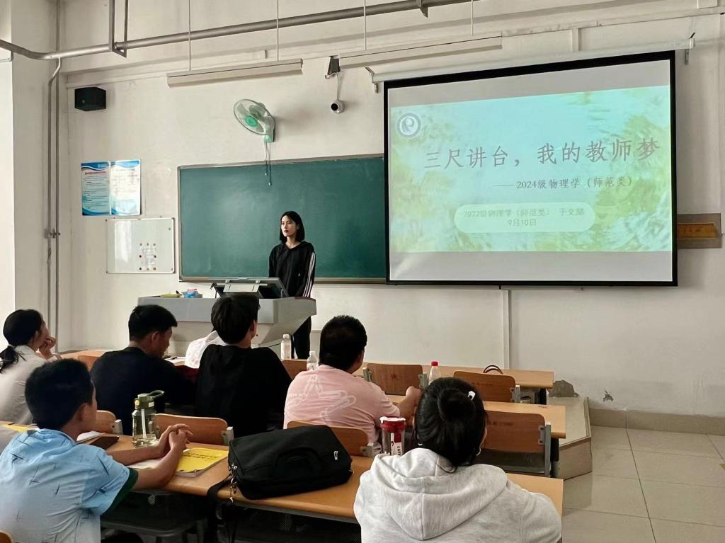 为大力弘扬教育家精神,引导广大师范生坚定从教信念、厚植教育情怀,9月10日下午,滚球买球的app官网在求真楼0110教室开展24级物理学师范生“我的教师梦”主题演讲活动。学院团委书记贾延琨 、辅导员赵剑桥、宋言昕 参加。
