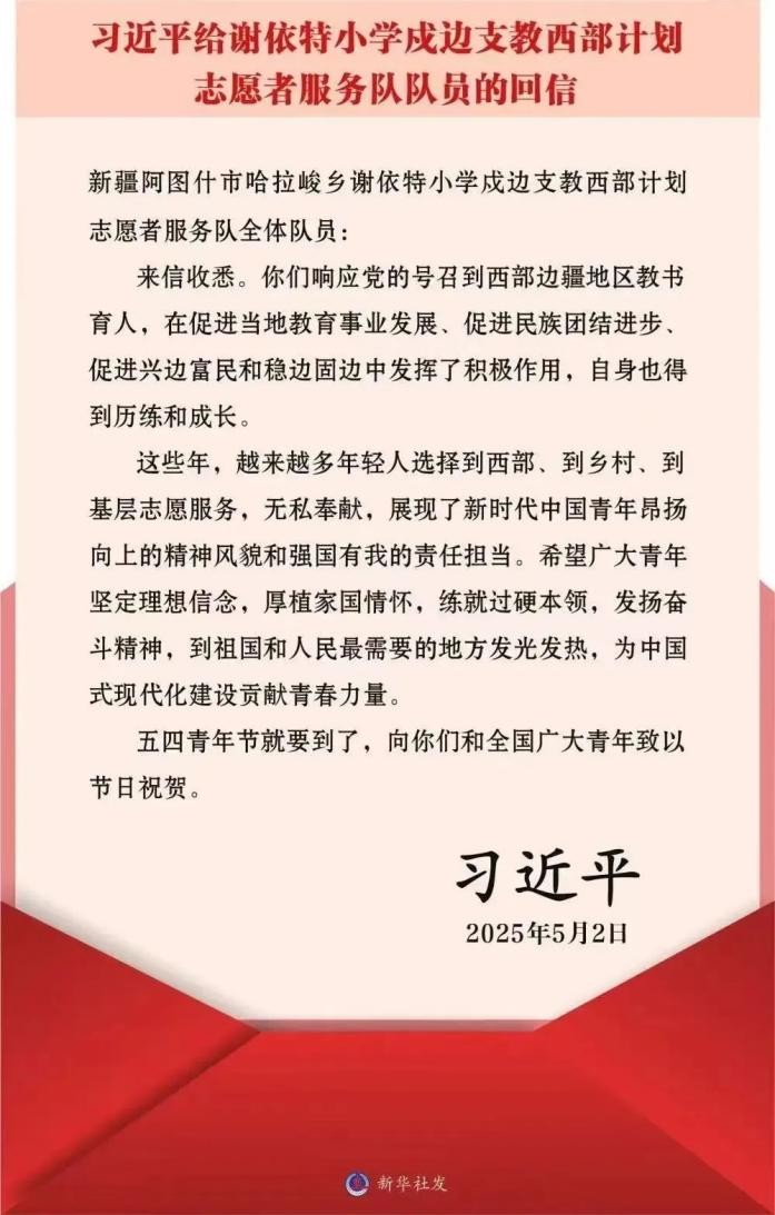 在五四青年节即将来临之际,习近平总书记给新疆克孜勒苏柯尔克孜自治州阿图什市哈拉峻乡谢依特小学戍边支教西部计划志愿者服务队全体队员回信,向全国广大青年致以节日祝贺并提出殷切期望。