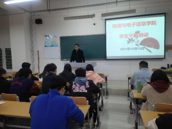 为进一步深化学生会改革,提高学生干部的综合素质,10月19日下午,物理与电子信息学院在明理楼118教室召开学生会工作人员全员培训会。本次学生培训会共有23名学生干部参加。