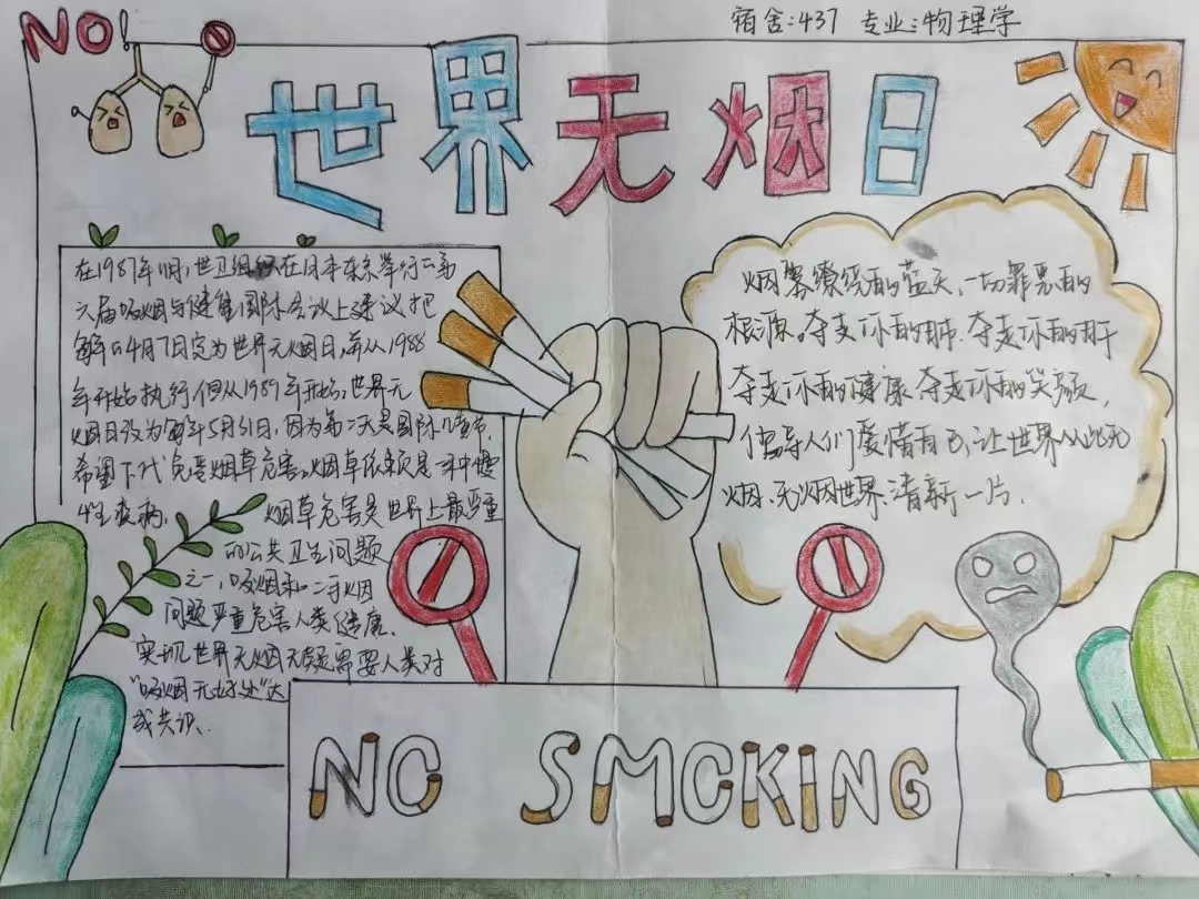 在此次活动中,同学们的作品构图新颖,版面美观,内容丰富多彩,字迹工整,寓意深刻。同学们用精妙绝伦的绘画,简洁工整的文字展现对校园禁烟的支持,也让同学们对吸烟的危害和禁烟的必要性有了更深一步的认识,唤起控制烟草危害的责任感,营造健康的校园环境,建设无烟校园。宣传部最终通过对选手作品的版图,内容,书写等方面进行评分,最终评选出一、二、三等奖。