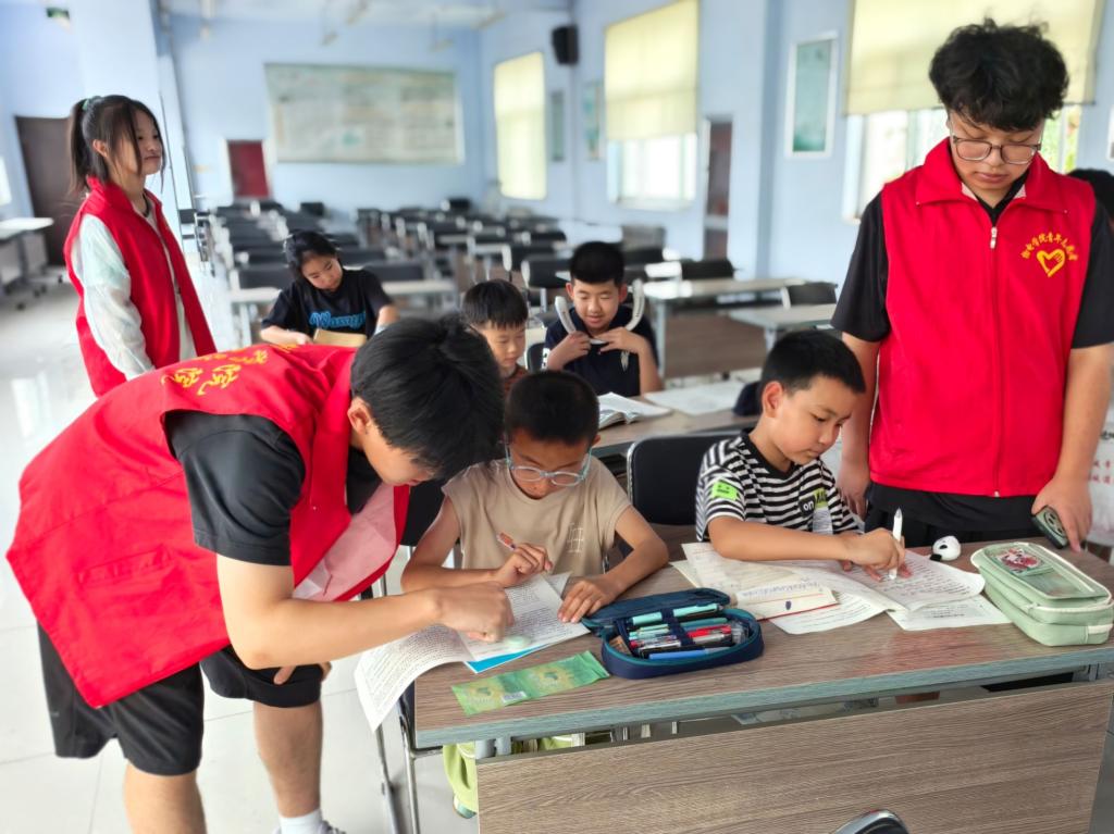 活动现场,志愿者们在社区为小朋友们提供全方位学习辅导。他们陪伴孩子们自主完成课业,逐份细致检查作业质量,针对数学应用题、语文作文等易错题型开展"一对一"精准辅导。创新实施"学科分段辅导+专项能力提升"模式,结合各年级知识难点,穿插数学速算技巧特训、语文阅读方法精讲等专题课程。通过设置"知识闯关""趣味问答"等互动环节,将枯燥的知识点转化为生动的学习游戏,让小朋友们在寓教于乐中夯实知识基础。