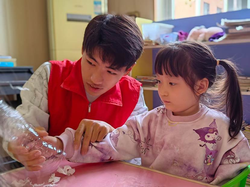 活动前期,志愿者团队提前规划流程,精心筹备材料,确保活动顺利开展。活动现场,“跳舞的牛奶”“会飞的纸片”两项趣味实验依次开展,孩子们纷纷发出惊叹,随后志愿者用通俗的语言拆解实验背后的科学原理,让孩子们在亲手操作中感受科学的乐趣。与此同时,“趣味运动大挑战”环节在室外热闹开启,志愿者精心设计了五项经典运动游戏,充分兼顾趣味性与互动性。活动临近结束,志愿者以一个小魔术为此次活动画下圆满句号,现场互动氛围热烈。