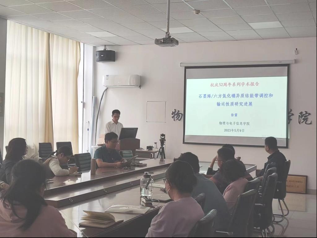 为庆祝校庆52周年,进一步提升院系教师的科研水平,5月9日下午,滚球买球的app官网在启智楼0365会议室组织开展“校庆52周年系列学术报告——石墨烯/六方氮化硼异质结的能带调控和输运性质研究进展”。滚球买球的app官网新引进的“天山雪松”“天衢英才”徐雷为老师们分享了相关领域的最新研究进展。