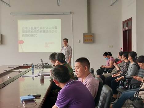 首先,本次结题的项目主持人王晓欣老师代表团队以“应用于蓝藻污染水体中微囊藻毒素检测的石墨烯电信号传感器研究”为题,详细说明了项目的完成情况、介绍了项目主要研究成果、分析了项目研究的不足之处。