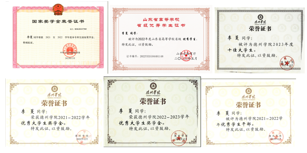 李蔓学习态度严谨认真,目标明确坚定,以孜孜不倦的精神,深入钻研专业知识。自踏入大学校门起,她的成绩便如同芝麻开花般节节高升,始终在年级内名列前茅。曾获2021-2022学年度国家奖学金、2022年度山东省优秀学生、2023年度德州学院十佳大学生以及校级奖学金3次。