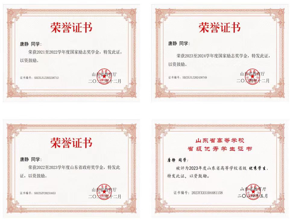 在校学习期间,唐静积极进取,刻苦钻研,温故知新,学以致用。在课堂上,唐静态度端正、谦逊有礼,积极配合老师教学,努力提高自身的知识储备与专业技能。连续两年专业成绩位列专业第三,综合素质测评成绩位列专业第二。2021-2022学年获得国家励志奖学金、优秀大学生奖学金及综合一等奖学金,并于2022-2023学年获得省政府奖学金。