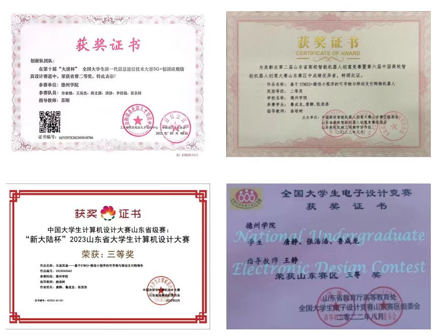 在课余时间,唐静积极参加专业科技竞赛和创新创业活动,在竞赛中,尽可能将所需要将所学的专业知识融入到项目之中,学以致用,融会贯通,同时不断学习新知识与新技能,进一步充实提高。曾获山东省大学生物理实验大赛省级一等奖、中国高校智能机器人创意大赛省级二等奖、第十届“大唐杯”全国大学生新一代信息通信技术大赛省级二等奖、中国大学生计算机设计大赛省级三等奖、全国大学生电子设计竞赛省三等奖等省级奖6项、校级奖8项。