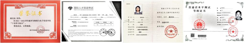 大学期间学业成绩始终保持在专业前列,连续两年获得"优秀大学生"奖学金,2022年获省级政府奖学金。她始终保持着对学习的热情和专注,将每一个知识点都视为通往成功的阶梯,“书山有路志为梯,学海无涯恒作舟”的治学态度激励她不断突破自我。顺利通过大学英语四级、普通话水平测试及高中物理教师资格考试,毕业时即考入高中物理教师编制,实现专业对口就业,优异的学习成果为职业生涯奠定坚实基础。