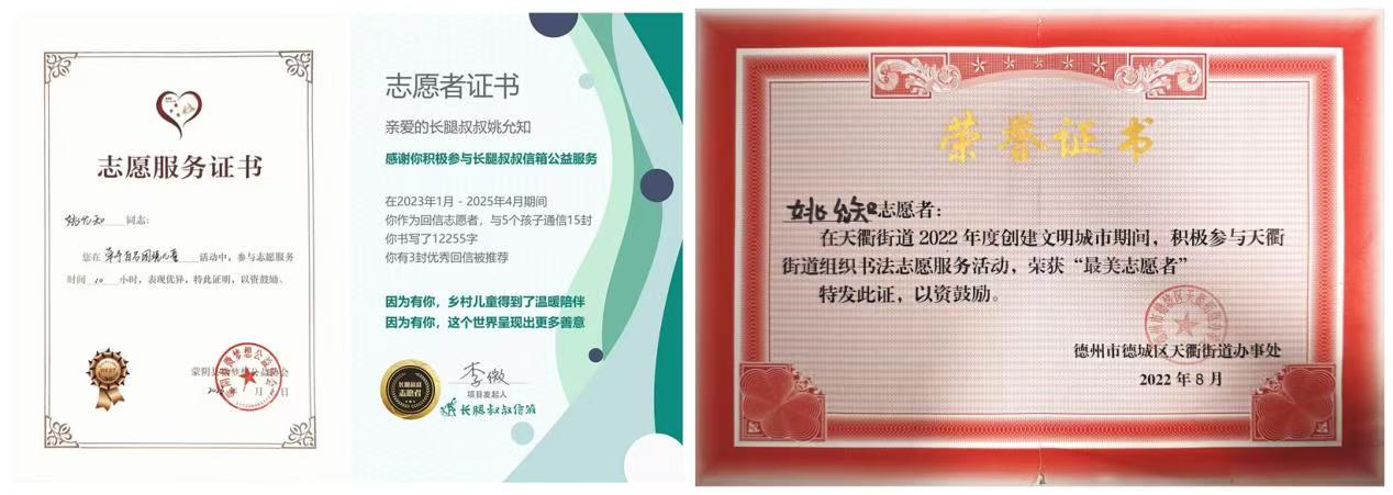 作为“沂蒙微梦想团队”成员助力家乡科普教育,通过“长腿叔叔信箱”为乡村青少年解答物理疑问;获评德州市德城区天衢街道创城工作“最美志愿者”。她始终以“教育点亮人生”为信念,将志愿服务作为践行教育情怀的第二课堂,用专业知识回馈社会,用行动诠释新时代青年的责任担当。这些经历不仅传递了温暖,也让她在奉献中收获了成长。